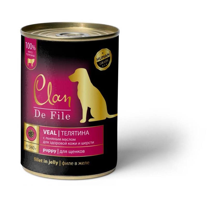 Clan De File представляет собой влажный корм, который служит полноценным рационом для щенков, обеспечивая их повседневные потребности в питательных веществах.