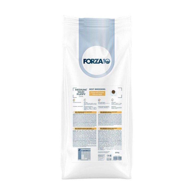 Линейка кормов Breeders - профессиональные корма для людей,у которых большое количество животных. Удобные большие упаковки, и лучшее ценовое предложение. Линейка кормов использует все технологии FORZA10: микрокапсулы, экстракты лекарственных растений, чистейшие отборные ингредиенты, гипоаллергенность. Вы сможете найти подходящий рацион именно для вашего питомца. Корм с курицей для щенков средних и крупных пород от 2-х до 12 месяцев и сук в период беременности и лактации. Ежедневный корм для щенков средних и крупных размеров с хорошим состоянием здоровья; владельцы, которых хотят кормить свою собаку "биологически чистым" куриным мясом, выращенном на свободном выгуле солнечной Италии и произведенном на фабрике собственного производства.