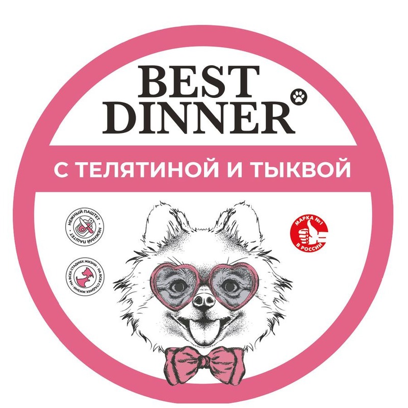 Полнорационный паштет для собак миниатюрных пород Best Dinner с телятиной и тыквой полностью удовлетворяет потребность собак в белках, витаминах и минералах. Диетическое мясо телятины отлично подходит для чувствительного пищеварения. Рыбий жир является источником энергии и Омега-3 жирных кислот для поддержания здоровь кожи и шерсти. Оптимальное содержание влаги облегчает поедание корма, помогает организму лучше усваивать витамины и минералы. Приятный мясной запах консервированного корма повышает вкусовую привлекательность и аппетит.