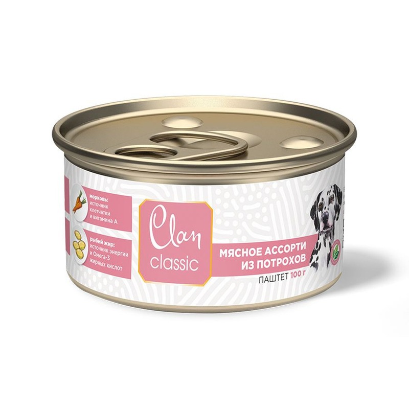 Clan Classic влажный корм для взрослых собак паштет Мясное ассорти с потрошками, в консервах - 100 г х 8 шт повседневный премиум для взрослых с потрошками для всех пород консервы (в железной банке) Российский корм 1 уп. х 6 шт. х 0.6 кг