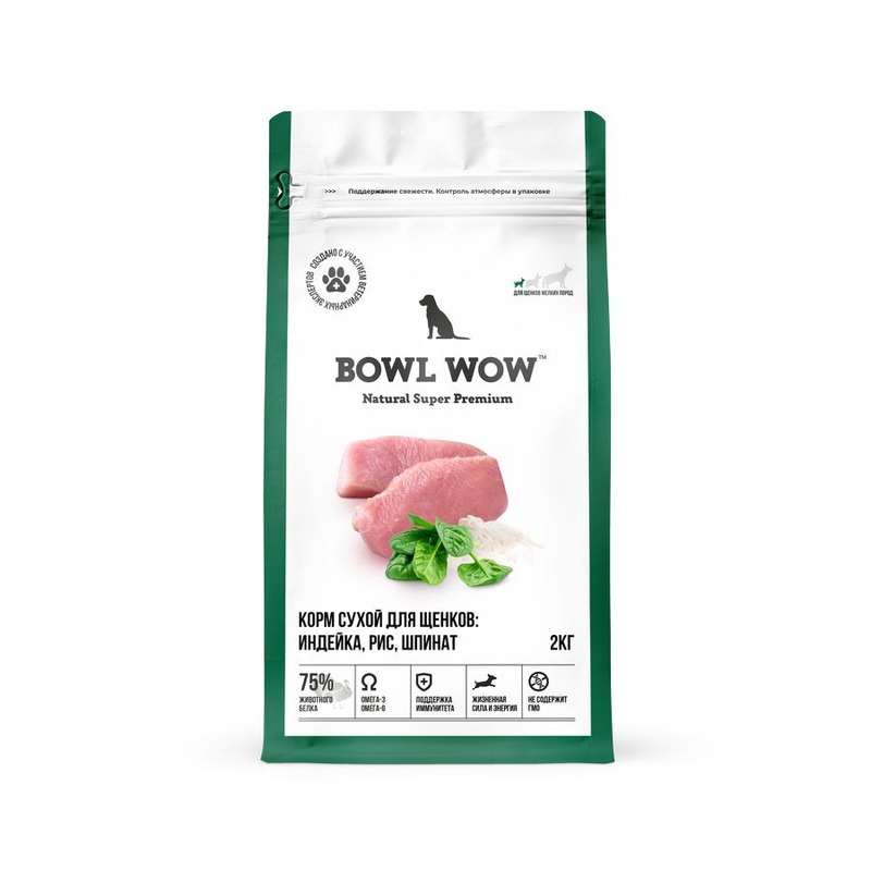 Bowl Wow сухой корм для щенков мелких пород, полнорационный, с индейкой, рисом и шпинатом - 2 кг супер премиум для щенков с индейкой породы мелкого размера мешок Российский корм 1 уп. х 1 шт. х 2 кг