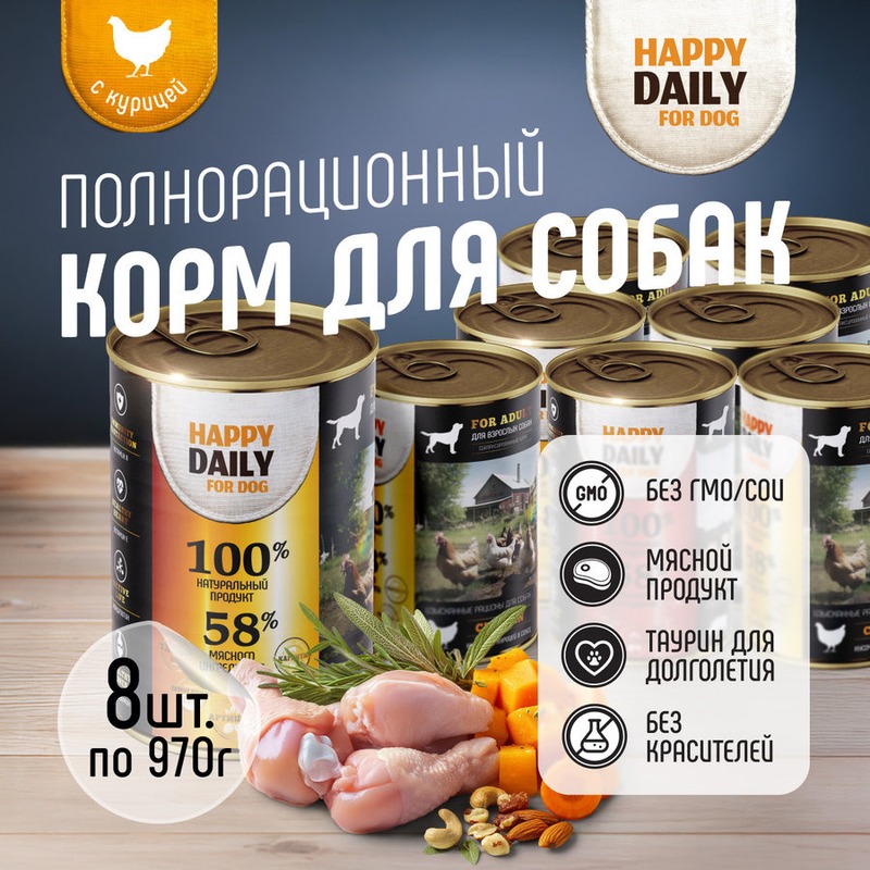 Happy Daily — это забота о полноценном, разнообразном и безопасном питании взрослых собак всех пород. Секрет качества корма заключается в его сбалансированном составе. Отборные куриные кусочки в сочетании с питательным соусом обогащают организм собаки необходимыми белками и минералами. Гипоаллергенный состав корма не содержит сои, искусственных ароматизаторов и консервантов, что делает его безопасным и легко усваиваемым, минимизируя возможные риски аллергических реакций.