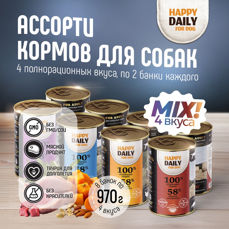 Happy Daily влажный корм для собак, ассорти 4 вкуса, в консервах - 970 г x 8 шт повседневный супер премиум для взрослых с говядиной для всех пород консервы (в железной банке) Российский корм 1 уп. х 8 шт. х 7.76 кг