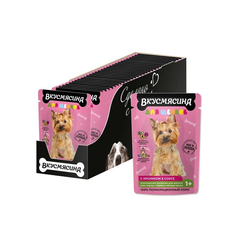 Полнорационный консервированный корм для щенков ВКУСМЯСИНА - это сочные мясные кусочки в ароматном соусе. Корм разработан по специальной рецептуре, учитывающей все потребности и физические особенности щенков. Он содержит все необходимые витамины, минералы и питательные вещества, поддерживающие здоровье вашего любимца. Подходит для ежедневного кормления щенков с первого месяца жизни. Не содержит сою, искусственные красители, консерванты и ГМО.