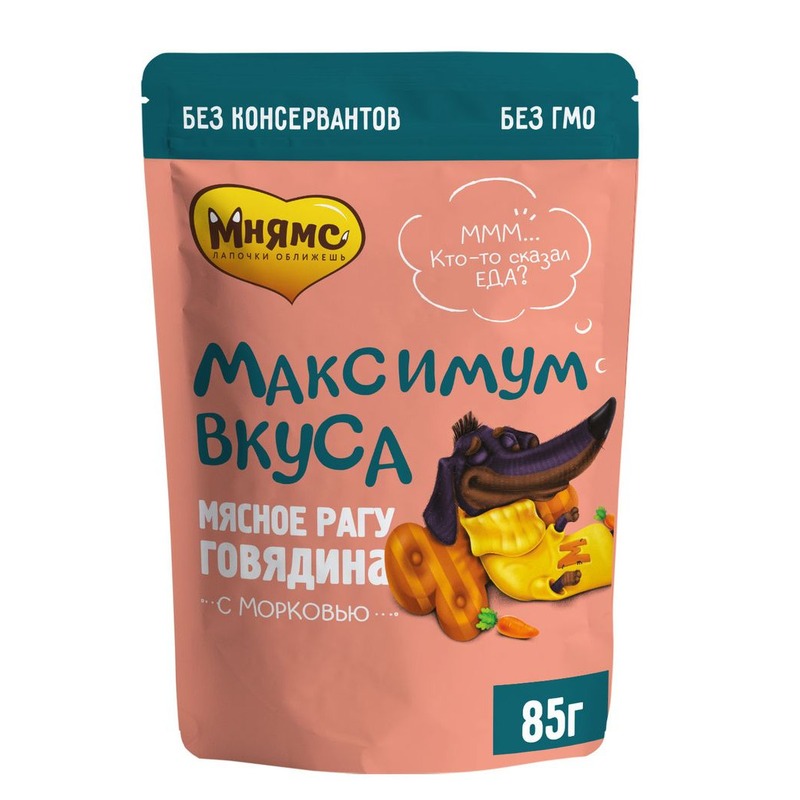 Мнямс Максимум вкуса полнорационный влажный корм для собак мелких и средних пород, мясное рагу с говядиной и морковью, кусочки в соусе, в паучах - 85 г повседневный премиум для взрослых с говядиной породы мелкого размера паучи Российский корм 1 уп. х 24 ш