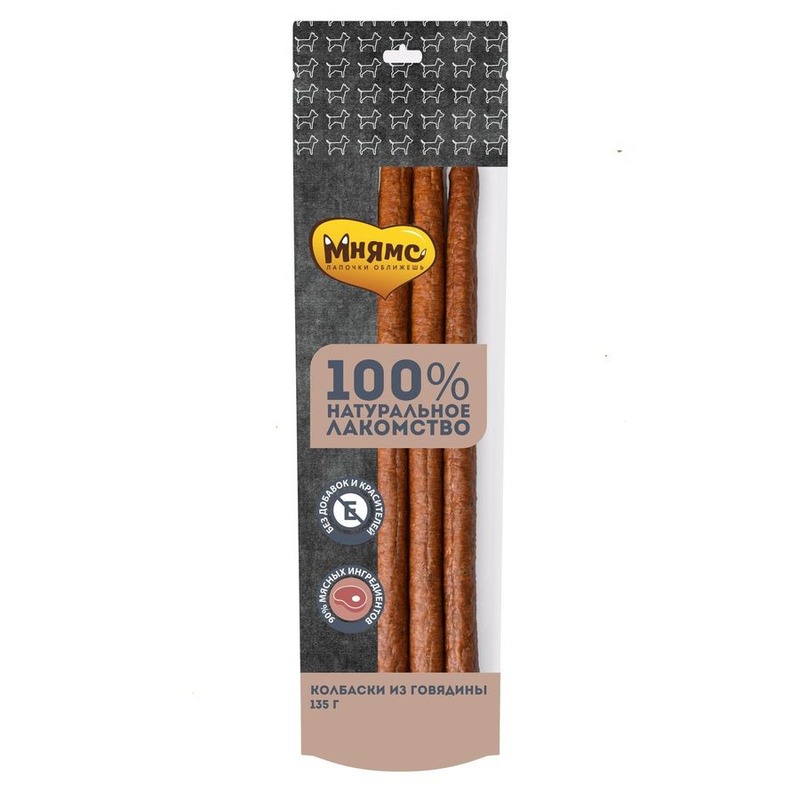 колбаски из говядины– это вкусное угощение и отличный способ поощрить питомца при дрессировке. Имеют мягкую консистенцию, идеально подходят в качестве ежедневного угощения для собак всех пород и возрастов.