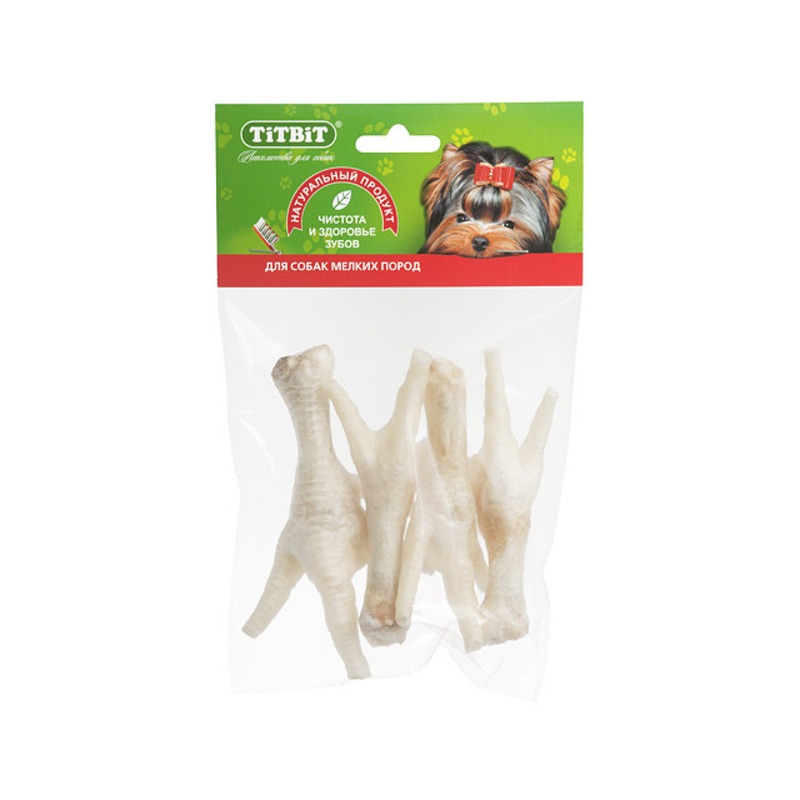 Titbit лапки куриные - мягкая упаковка. Обеспечивает дополнительное поступление в организм необходимых элементов для роста, развития и поддержания в норме суставов. Привлекательное лакомство для собак мелких пород, используется как игрушка, отлично очищает зубы и массирует десны. Применять с осторожностью для собак с аллергией на куриный белок. Изделие содержит трубчатую кость и не предназначено для полного поедания. Как только собака съела футляр из кожи, сухожилий и мышц – необходимо заменить лакомство на новое.