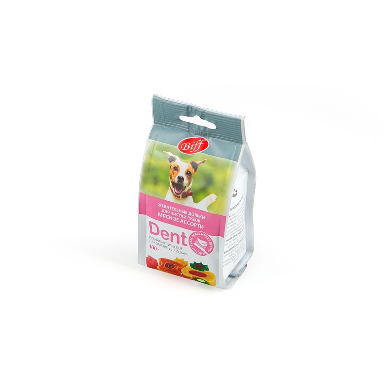 Biff «Dent» мясное ассорти – это жевательный снек для собак, необходимый для снятия мягкого зубного налета, снижения уровня зубного камня и массажа десен за счет специально разработанной формы и текстуры, используется в качестве лакомства и поощрения.