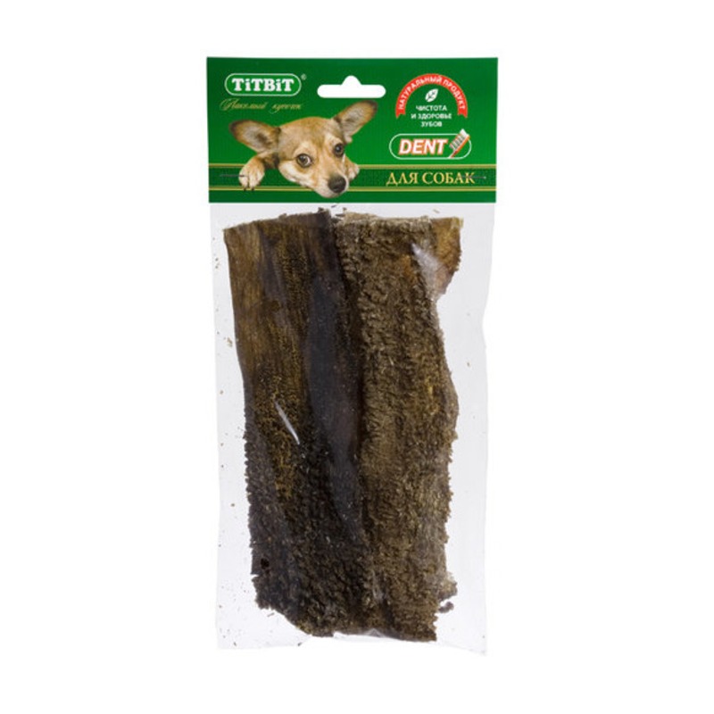 Высушенные пластины говяжьего рубца.Упаковка содержит 5-6 пластин длиной 19 см. Рубец говяжий представляет собой часть желудка КРС, точнее - первый из его преджелудков, в котором содержится полезная микрофлора. Ворсинки неочищенного сушёного рубца сохраняют на себе ферменты и витамины группы «В», вырабатываемые его микрофлорой при жизни животного. Содержат низкокалорийный, легкоусвояемый белок. Благодаря особой технологии сушки сохраняется до 60% процентов полезных веществ.