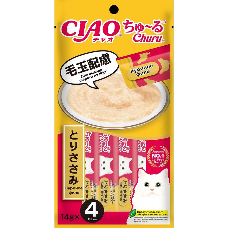Супер-премиальное функциональное лакомство пюре Ciao Churu для кошек на основе кусочков нежного филе курицы от японского производителя Inaba изготовлено исключительно из натуральных полезных ингредиентов и отличается высоким процентом влажности, благодаря чему поддерживается водный баланс организма кошки. Кремовая текстура, напоминяющая пюре или суп, подойдет даже самым привередливым кошкам и котам или кошкам с чувствительным пищеварением. Содержит в составе клетчатку, которая способствует выводу шерсти и волосяных комочков из ЖКТ.