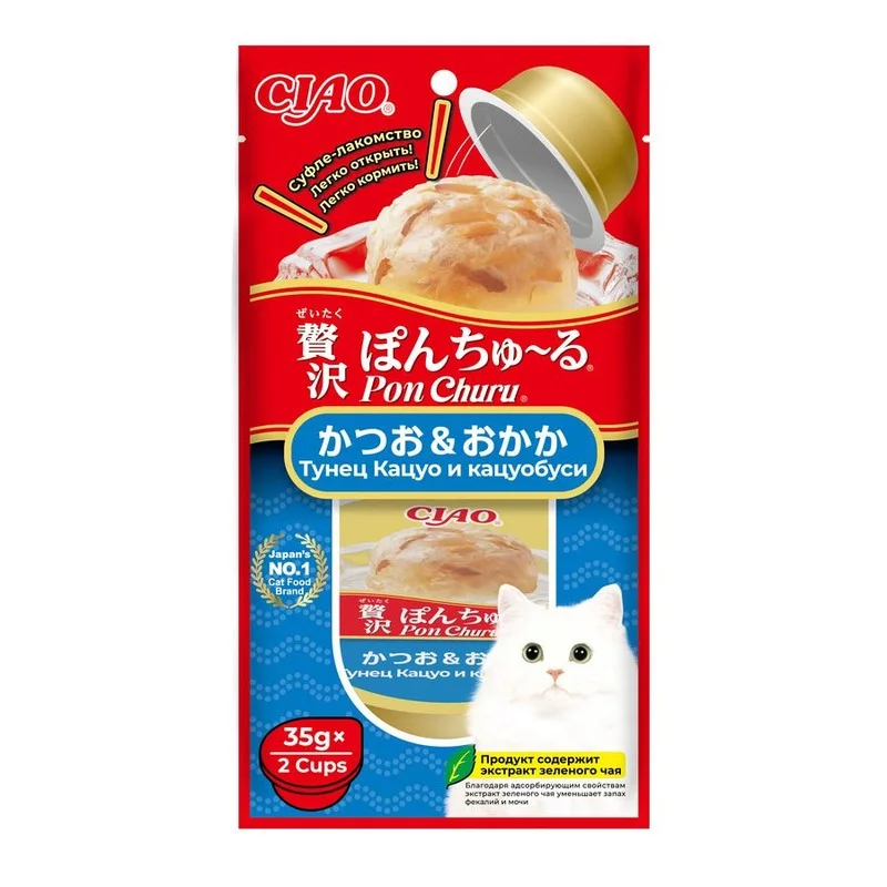 Супер-премиальное лакомство суфле Ciao Pon Churu для кошек на основе кусочков мяса тунца Кацуо и кациобуси от японского производителя Inaba изготовлено исключительно из натуральных полезных ингредиентов и отличается высоким процентом влажности, благодаря чему поддерживается водный баланс организма кошки. Нежная текстура, напоминяющая паштет или суфле в желе, подойдет даже самым привередливым кошкам и котам или кошкам с чувствительным пищеварением.