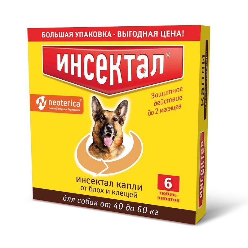 Нанесите Инсектал на кожу в области холки (между лопатками), максимально раздвигая шерсть. Не растирайте препарат пальцами. Не рекомендовано мыть животное 2 дня до и 2 дня после обработки. Действующие вещества: фипронил — 10%, пирипроксифен — 2%.