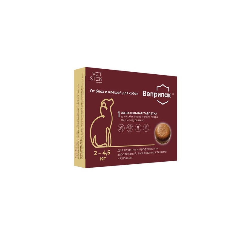 Vetstem Веприпак таблетка от блох и клещей для собак весом 2 - 4,5 кг, 1 таблетка в упаковке - 112,5 мг от блох для всех возрастов Россия 1 уп. х 1 шт. х 0.04 кг Средства от паразитов Старая Ферма | V4.Ru: Маркетплейс