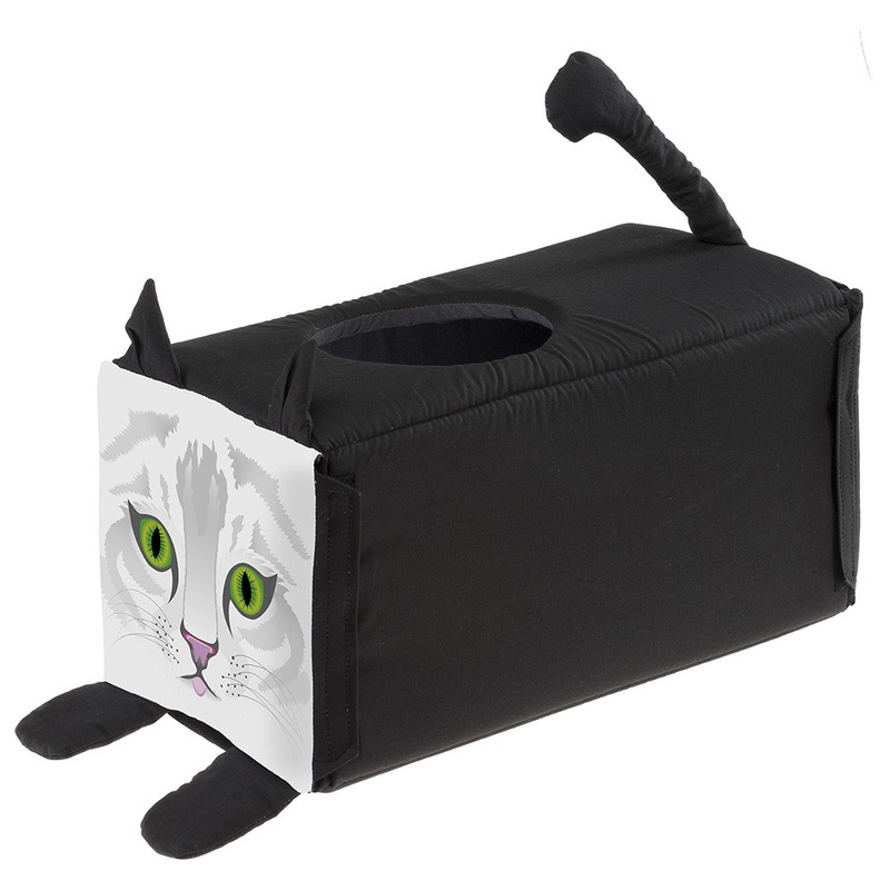 Клео – это кошачий дом, который выглядит как коробка, но имеет отверстие внутри, поэтому ваш котенок может прыгать прямо в него. Ваша кошка будет чувствовать себя защищенной и безопасной внутри благодаря удобной внутренней прокладке, все время готовой выскочить, когда он слышит шум. Изготовлен из мягкого хлопка, он поставляется с забавными украшениями: хвост, уши и лапы. На другой стороне есть кошачья морда, выглядывающая на вас своими замечательными зелеными глазами!