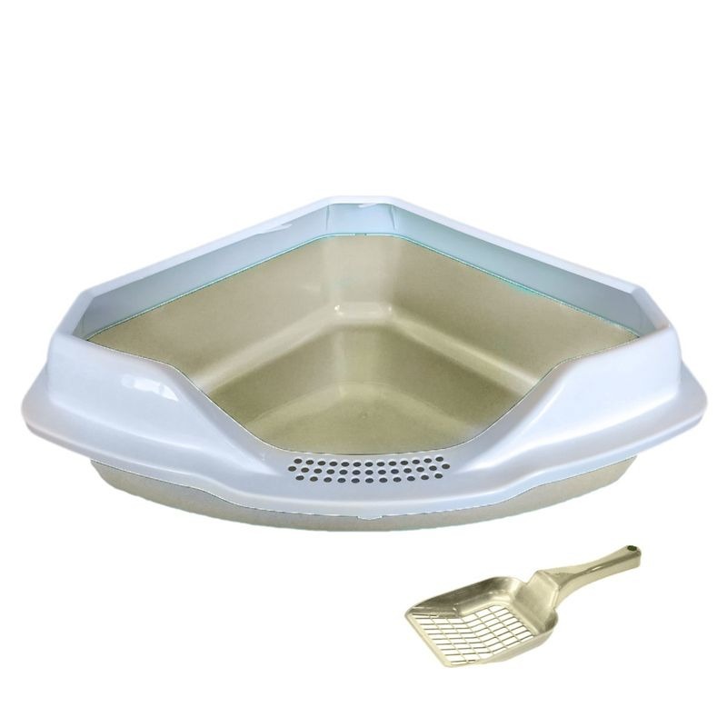 Туалет угловой, с бортиком. Изготовлен из прочного нетоксичного пластика. Туалет открытый, оснащен бортиком, что предотвращает разбрасывание наполнителя вокруг лотка. В комплект входит совок для уборки туалета. Размер: 56х42х17 см.