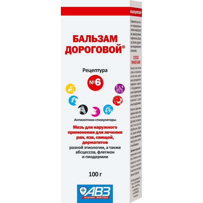 При лечении инфицированных гнойной микрофлорой ран, свищей, пролежней, трофических язв, абсцессов, флегмон, дерматитов и пиодермии различной этиологии «Бальзам Дороговой®» № 6 наносят тонким слоем на пораженные участки кожи, равномерно распределяя по поверхности с захватом 2-3 см здоровой кожи (с целью предупреждения распространения очага воспаления). Лекарственное средство наносят 1-2 раза в день до выздоровления животного.