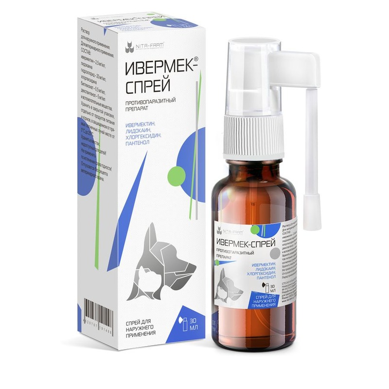 Описание: современный препарат для борьбы с акарицидными заболеваниями домашних животных, обладающий уникальным многокомпонентным составом, улучшающим состояние домашних животных за счет местного анестезирующего, регенерирующего и антисептического действия. Препарат по внешнему виду представляет собой прозрачную бесцветную или светло-желтого цвета жидкость. Выпускают Ивермек-спрей расфасованным по 30 мл в стеклянные флаконы соответствующей вместимости с навинчиваемыми крышками, оснащенными спрей-насадками, что облегчает нанесение препарата на пораженную поверхность.
