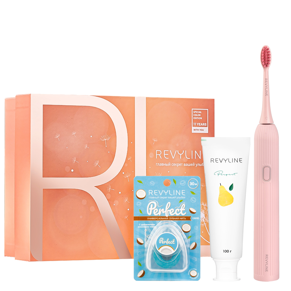 В наборе – нежно-розовая звуковая щетка RL 060, паста с ароматом спелой груши и зубная нить с натуральным маслом кокоса.