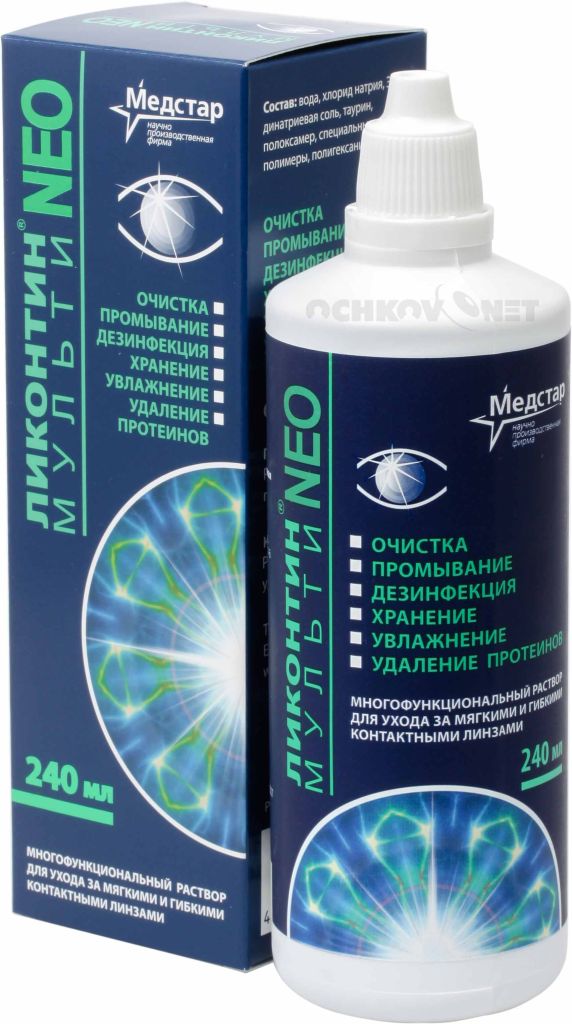 Многофункциональный раствор "Ликонтин Нео Мульти" служит для бережного и эффективного ухода за контактными линзами.