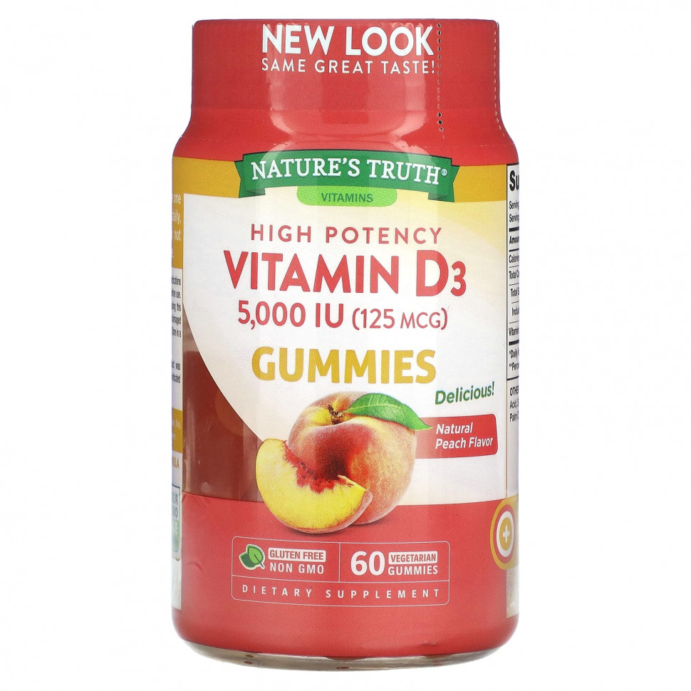 Описание ВитаминыПревосходный вкус!Не содержит глютенаБез ГМОПищевая добавкаУдовлетворение качеством гарантированоВегетарианская формулаПознакомьтесь с солнечными лучами и получите суточную дозу витамина D3, необходимого для здорового образа жизни! Рекомендации по применению Взрослым принимать по одной вегетарианской жевательной мармеладке в день, желательно во время еды. Не превышайте рекомендуемую дозировку. Ингредиенты сахара, глюкозный сироп, пектин, лимонная кислота, цитрат натрия, натуральные ароматизаторы, натуральная глазурь из пальмового листа, пальмовое масло, концентрат сока черной моркови (краситель), куркума.Не содержит глютена, пшеницы, дрожжей, молока, лактозы, сои, искусственных ароматизаторов, искусственных подсластителей. Предупреждения Перед началом применения во время беременности, кормления грудью, приема препаратов или при наличии каких-либо заболеваний следует проконсультироваться с врачом. При возникновении любых побочных реакций следует прекратить прием и обратиться к врачу. Не следует использовать данный продукт, если защитная пленка под крышкой повреждена или отсутствует. Хранить в недоступном для детей месте. Хранить в сухом и прохладном месте. Избегать воздействия высоких температур. Чтобы обеспечить качество в течение срока годности, эта пищевая добавка производится с более высоким уровнем ингредиентов, чем указанное количество в 1 порции.