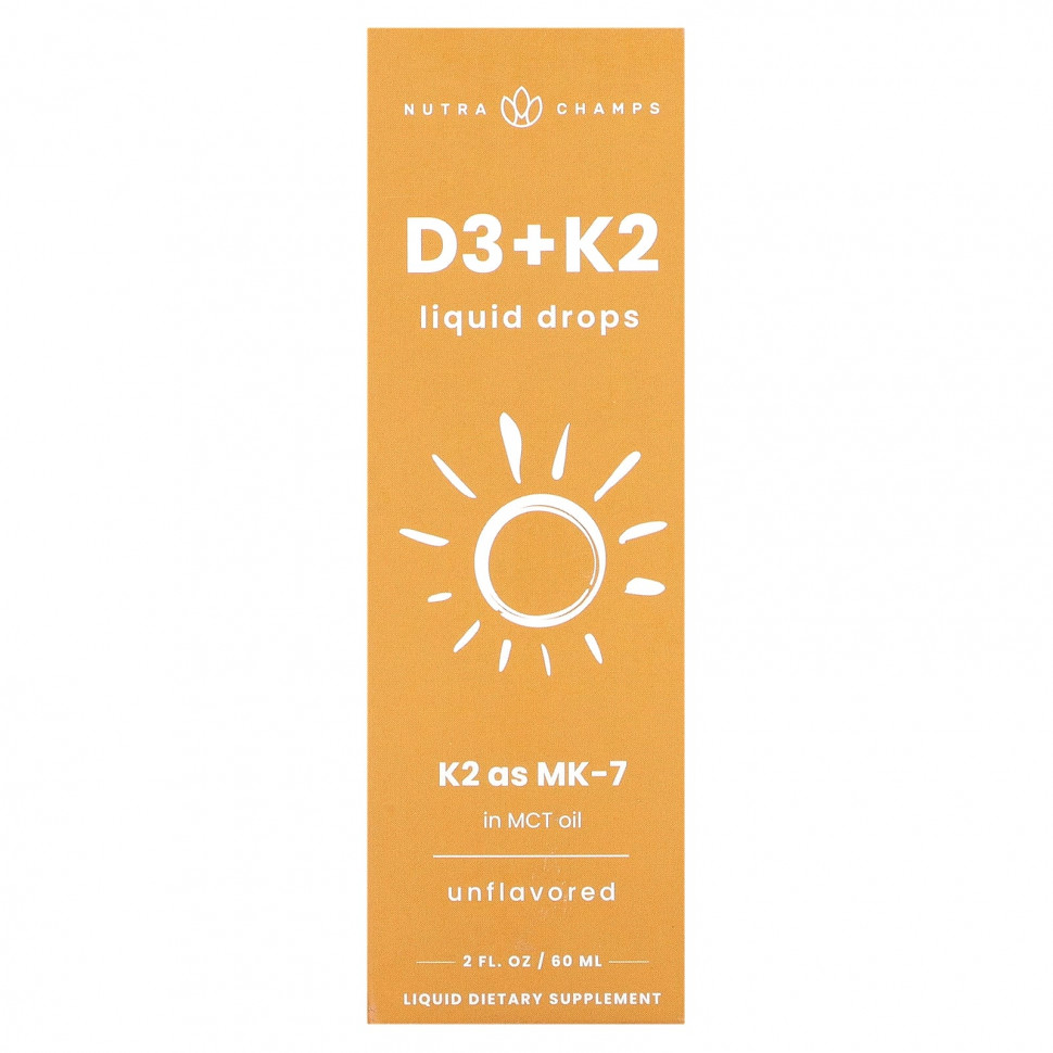 Описание K2 в виде МК-7 в масле MCTЖидкая пищевая добавкаФормула 2 в 1В масле MCT с высокой абсорбциейВегетарианский продуктБез ГМОПродукт прошел лабораторные испытанияКачество, отвечающее нормам надлежащей производственной практики (GMP)Без глютена, сои, яиц, орехов, молочных продуктов и консервантовЕстественно поддерживает:Иммунную системуздоровье сердца.Кости и зубы Функция мышцОбщее самочувствиеNutraChamps D3 + K2 сочетает в себе незаменимые витамины в хорошо усваиваемой жидкой форме. При совместном приеме эти питательные вещества работают вместе, чтобы оптимизировать поток кальция через ваш организм и обеспечить максимальную отдачу от витамина D3. Рекомендации по применению Хорошо встряхните перед использованием. Возьмите 1 мл. Поместите в рот и проглотите. Для достижения наилучших результатов принимайте ежедневно не менее 30 дней. Хранить в сухом и прохладном месте.