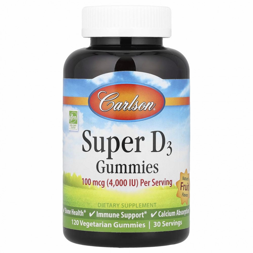 4000 МЕ (100 мкг) в 1 порцииПищевая добавкаЗдоровье костейУкрепление иммунитетаВпитывание кальцияCarlson поставляет биологически активные добавки высочайшего качества с 1965 годаНе содержит глютенаБез соиБез искусственных консервантовГарантия качества и эффективностиПредприятие подконтрольно Управлению по санитарному надзору за качеством пищевых продуктов и медикаментов США (FDA)Жевательные мармеладки с витамином D3 содержат 4000 МЕ (100 мкг) витамина D3 в каждой порции, что способствует здоровью зубов, костей и мышц, нормальной функции иммунной и сердечно-сосудистой системы, а также усвоению кальция. Каждый флакон содержит ассорти из вкусных жевательных мармеладок со вкусом клубники, лимона и апельсина. Жевательные супермармеладки с витамином D3 — это способ без хлопот получать витамин D каждый день.