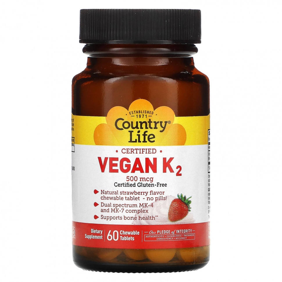 Пищевая ценностьРазмер порции: 1 жевательная таблетка Количество в 1 порции% от суточной нормыВитамин K2 (в виде менахинона МК-4 и MK-7)500 мкг** Суточная норма не определена. Компания основана в 1971 годуБез глютена, сертификат Certified Gluten-FreeЖевательная таблетка с натуральным клубничным вкусом. Никаких традиционных таблеток!Комплекс двойного спектра с МК-4 и МК-7Поддерживает здоровье костейПищевая добавкаСертификат B CorporationГарантия профессиональной добросовестностиПодлинностьЧистотаСвежестьПостоянствоНадежностьНовые исследования показывают, что витамин K2 способствует формированию костей. Для оптимального здоровья костей включите в рацион витамин K вместе с кальцием и витамином D. Country Life использует комплекс витаминов K2 двойного спектра, в который входит 400 мкг MK-4 и 100 мкг MK-7. Эта вкусная жевательная таблетка делает прием добавок проще, чем когда-либо — вам не нужно глотать таблетки, запивая водой. ДАОтсутствие глютена подтверждено сертификатом GFCO.org