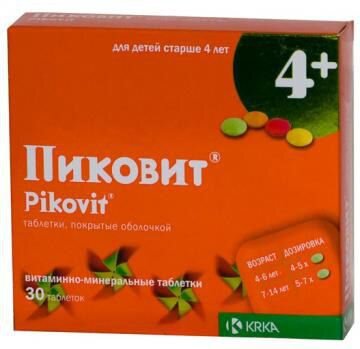 Показания Состояния, сопровождающиеся повышенной потребностью у детей в витаминах, кальции и фосфоре: - снижение или отсутствие аппетита, - переутомление детей школьного возраста, - в качестве вспомогательной терапии при приеме антибиотиков, - неполноценное и несбалансированное питание в том числе, в результате недостаточного потребления свежих овощей и фруктов. Противопоказания Противопоказания Повышенная чувствительность к компонентам препарата.Гипервитаминоз А и D. Тяжелая почечная недостаточность (КК менее 30 мл/мин). Детский возраст до 4-х лет. С осторожностью: Беременность Применение и дозы Таблетки следует держать во рту до полного растворения. Детям в возрасте от 4 до 6 лет: по 1 таблетке 4-5 раз в день. Детям в возрасте от 7 до 14 лет: по 1 таблетке 5-7 раз в день. Курс лечения - 1 месяц, необходимость более длительного приема определяется врачом. Прием препарата детьми до 14 лет по рекомендации врача. Побочные эффекты и передозировка Побочные эффекты: Аллергические реакции (в этих случаях, следует прекратить прием препарата и проконсультироваться у врача). ПИКОВИТ Д содержит 0,9 г малтитола, в связи с этим прием доз, превышающих рекомендуемые, может вызвать диарею. Передозировка: Длительный прием (более 1 месяца) очень высоких доз может привести к гипервитаминозу D и А: однако риск передозировки при приеме Пиковита Д маловероятен. Длительный прием высоких доз витамина В6 может привести к случаю периферической нейропатии. Маннитол и малтитол недостаточно абсорбируется в желудочно-кишечном тракте и в высоких дозах могут привести к диареи и метеоризму. Слабительный эффект развивается при приеме более 60 г малтитола (66 таблеток, покрытых оболочкой) или более 10 г маннитола (68 таблеток, покрытых оболочкой) в день. Лечение симптоматическое. Взаимодействие с другими ЛС: Фармакологическое действие и фармакокинетика ПИКОВИТ Д содержит 10 наиболее важных витаминов, а также кальций и фосфор. Витамины группы В (В1 В2, В6, В12), пантотеновая кислота и никотинамид участвуют в метаболизме углеводов, белков и жиров. Фолиевая кислота неактивна, однако в организме она превращается в биологически активный кофермент - тетрагидрофолиевую кислоту, который необходим для биосинтеза нуклеиновых кислот. Он усиливает рост и участвует в созревании эритроцитов. Фолиевая кислота участвует в образовании и регенерации тромбоцитов и их функции. Витамин А необходим для развития эпителиальных клеток и синтеза зрительного пигмента. Витамин D участвует в обмене кальция и способствует правильной минерализации костей и зубов. Витамин С ускоряет абсорбцию железа и принимает участие во многих окислительно-восстановительных процессах в организме. Кальций и фосфор играют ключевую роль в минерализации костей и зубов. Ионы кальция активизируют многочисленные ферменты, они принимают участие в регулировании тонуса сердечной мышцы, в передаче нервных импульсов и регулируют проницаемость мембран клеток. Водорастворимые витамины (витамины группы В, витамин С и биотин) хорошо абсорбируются в количествах, соответствующих суточным потребностям организма. Количества, превышающие уровень насыщения тканей, выводятся почками и в меньшей степени, через желудочно-кишечный тракт. После перорального приема жирорастворимые витамины А и D хорошо абсорбируются в тонкой кишке в п