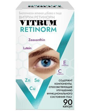 Компоненты биологически активной добавки к пище «ВИТРУМ РЕТИНОРМ» не синтезируются в организме человека, поэтому должны поступать извне с пищей или в составе биологически активных добавок к пище. Входящие в состав ВИТРУМ РЕТИНОРМ лютеин, зеаксантин, витамины С, Е и микроэлементы способствуют нормализации обменных процессов в тканях глаза, могут способствовать снижению риска развития возрастных изменений глаз. ЛЮТЕИН И ЗЕАКСАНТИН Наше зрение напрямую зависит от степени плотности макулы (желтого пятна) центральной части сетчатки. Растительные каротиноиды (лютеин и зеаксантин) накапливаются в желтом пятне, снижают вредное воздействие ультрафиолетовой части света. Они действуют как сильные антиоксиданты, блокируя действие свободных радикалов, которые повреждают ткани глаза и способствуют снижению зрения. ВИТАМИНЫ С И Е Являются распространенными антиоксидантами, которые дополняют действие друг друга, защищая ткани глаза от повреждения. Способствуют восстановлению зрительных пигментов (родопсин и др.) палочек и колбочек, отвечающих за нормальное свето- и цветовосприятие. Способствуют укреплению стенок и повышению эластичности кровеносных сосудов. ЦИНК, МЕДЬ, СЕЛЕН Необходимые микроэлементы для поддержания функции зрения. Способствуют улучшению питания глаз. Недостаточное потребление данных микроэлементов может привести к ухудшению зрения. Компоненты, входящие в состав ВИТРУМ РЕТИНОРМ: лютеин, зеаксантин, витамины С, Е и микроэлементы способствуют улучшению функционального состояния и нормализации обменных процессов в тканях глаза, которые могут нарушаться при: - зрительном утомлении (работа за компьютером, чтение, вождение автомобиля, деятельность в условиях сниженной освещенности) - воздействии повышенного ультрафиолетового излучения (в летнее время, в условиях высокогорья, профессиональные факторы риска и др.) - ношении контактных линз и очков - возрастных изменений в сетчатке Состав витамин С (L-аскорбиновая кислота), наполнитель лактозы моногидрат, витамин E (DL-альфа-токоферола ацетат 50%), оболочка капсулы (желатин, вода, краситель оксиды и гидроксиды железа, краситель бриллиантовый голубой), экстракт цветков календулы лекарственной (Calendula officinalis), цинк (цинка цитрат), селен (обогащенные селеном дрожжи), экстракт цветков бархатцев прямостоячих (Tagetes erecta L.), антислеживающий агент магниевая соль стеариновой кислоты, медь (меди цитрат). Способ применения и дозы Взрослым по 3 капсулы в день во время еды. Продолжительность приема - 1 месяц. При необходимости прием можно повторить. Перед применением рекомендуется проконсультироваться с врачом. Противопоказания Индивидуальная непереносимость компонентов, беременность, кормление грудью