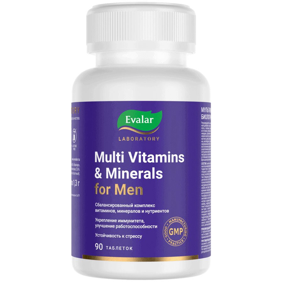 Состав: магния цитрат, кальция карбонат, целлюлоза микрокристаллическая (носитель), мальтодекстрин, кальция бисглицинат, магния бисглицинат, аскорбиновая кислота, кроскарамеллоза (носитель); компоненты пленочного покрытия (пищевые добавки): гидроксипропилметилцеллюлоза (загуститель), твин 80 (эмульгатор), полиэтиленгликоль (глазирователь), краситель натуральный синий; цинка бисглицинат, пальмы сабаль экстракт, чая зеленого экстракт, диоксид кремния аморфный и стеарат кальция (агенты антислеживающие), L-карнитина тартрат, альфа-токоферола ацетат, L-глутамин, таурин, альфа-липоевая кислота, холина битартрат, молибдат натрия, крахмал кукурузный, L-аргинин, никотинамид, марганца бисглицинат, лютеин, пантотенат кальция, эурикомы длиннолистной корня экстракт, инозитол, пантов марала экстракт, женьшеня экстракт, ретинола ацетат, меди бисглицинат, пиридоксина гидрохлорид, тиамина гидрохлорид, рибофлавин, холекальциферол, менахинон-7, зеаксантин, йодказеин, хрома пиколинат, селексен (селеноксантен), фолиевая кислота, метилкобаламин, биотин. Не содержит ГМО, глютен диоксид титана и лактозу. Описание: Мультивитамины и минералы мужские. «Мультивитамины и минералы мужские» от Эвалар - это инновационный комплекс, который был создан на основании новых технологий при производстве БАД с учетом особенностей мужского организма. Содержит 38 активных ингредиентов, которые идеально сочетаются между собой: легкоусваиваемые витамины, современные минералы, антиоксиданты и уникальные экстракты. Ежедневный прием поможет быть в тонусе, повысит иммунитет и работоспособность, восстановит силы, в том числе при интенсивных нагрузках. В состав витаминно-минерального комплекса для мужчин от Evalar Laboratory входят: - Биодоступные формы витаминов в составе: В12 - метилкобаламин, витамин К2 - менахинон-7. - Легкодоступные хелатные формы минералов: кальция, магния, цинка, меди, марганца. - Органический йод в форме легко усваиваемого йодказеина. Формула усилена натуральными растительными компонентами, которые положительно влияют на мужской организм. Среди них - экстракты пантов марала, пальмы сабаль, корня эурикомы длиннолистной, женьшеня и зеленого чая. Особый метод обработки растений помогает нам сохранить всю силу природы для вашего здоровья. Одна упаковка - 90 таблеток - рассчитана на курс приема 30 дней. Содержание в 3 таблетках (суточном приеме) и % от рекомендуемого уровня суточного потребления (адекватного уровня) Витамин А 1500 мкг РЭ1 187,5%3 Витамин С 150 мг 250%3 Витамин D 15 мкг (600 МЕ) 300%3 Витамин Е 10 мг ТЭ2 100% Витамин К2 (МК-7) 12 мкг 10% Тиамин (витамин В1) 4,8 мг 342,9%3 Рибофлавин (витамин В2) 6 мг 375%3 Ниацин (витамин В3) 20 мг 111,1%3 Витамин В6 6 мг 300%3 Фолацин 400 мкг 200%3 Витамин В12 (метилкобаламин) 3 мкг 300%3 Биотин 150 мкг 300%3 Пантотеновая кислота 15 мг 250%3 Кальций 300 мг 30% Магний 150 мг 37,5% Цинк 25 мг 166,6%3 Медь 2 мг 200%3** Марганец 2 мг 100%** Йод 150 мкг 100% Селен 150 мкг 214,3%3 Хром 120 мкг 240%3 Молибден 75 мкг 107,1%3 Таурин 25 мг 6,25% L-глутамин 25 мг 5% L-карнитин 25 мг 8,3 % L-аргинин 20 мг 0,3 % Холин 10 мг 2% Инозит 10 мг 2% Комплекс экстрактов: пальмы сабаль, зеленого чая, эурикомы, пантов марала, женьшеня 125 мг - липоевая кислота 25 мг 83,3% Лютеин 950 мкг 19% Зеаксантин 190 мкг 19% 1 РЭ - ретиноловый эквивалент; 2 ТЭ - токофероловый эквивалент; 3 - не превышает верхний допустимый уровень суточного потребления Показания: для реализации населению в качест