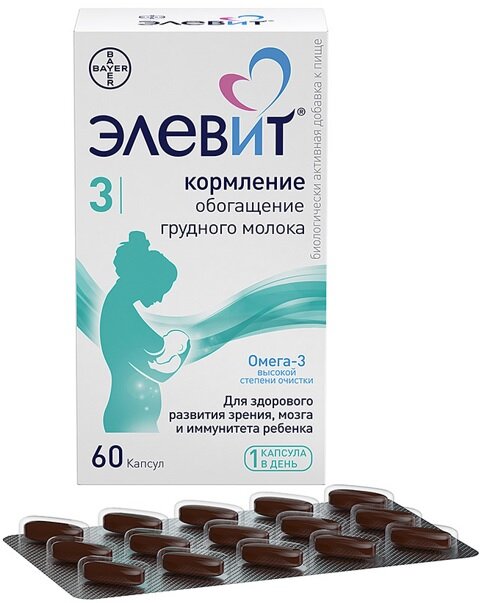 Состав Желатин, докозагексаеновая кислота (ДГК) из рыбьего жира, трикальций фосфат, агент влагоудерживающий глицерин, аскорбиновая кислота, эмульгатор соевый лецитин, носитель воск пчелиный желтый, никотинамид, цинка оксид, железа фумарат, кальция D-пантотенат (кальция D-пантетонат, носитель этилцеллюлоза), DL-альфа-токоферола ацетат, пиридоксина гидрохлорид, краситель железа оксид красный, рибофлавин, тиамина мононитрат, краситель железа оксид черный, ретинол (подсолнечное масло, бета-каротин), лютеин (сафлоровое масло, лютеин, антиокислитель DL-альфа-токоферол), фолиевая кислота, калия йодат, биотин, натрия селенит, холекальциферол (носитель эфир крахмала и натриевой соли октенилянтарной кислоты, сахароза, антиокислитель аскорбат натрия, триглицериды среднецепочечные, агент антислеживающий диоксид кремния аморфный, антиокислитель DL-альфа-токоферол, витамин D3), цианокобаламин (мальтодекстрин, регулятор кислотности цитрат натрия трехзамещенный, регулятор кислотности лимонная кислота, витамин В12). Продукт содержит компоненты, полученные с использованием генно-модифицированных микроорганизмов (ГММ). Продукт очищен от ГММ. Продукт не содержит генно-модифицированных организмов. Область применения Для реализации населению в качестве биологически активной добавки к пище – дополнительного источника омега-3 кислоты; витаминов А, В1, В2, В5, В6, В12, С, D, Е; ниацина, фолиевой кислоты, биотина, железа, йода, цинка, селена. Рекомендации по применению Кормящим женщинам принимать по 1 капсуле в день во время еды, начиная сразу после рождения ребенка и на протяжении всего периода кормления. Пищевые и биологически активные вещества Содержание в суточной дозе (в 1 капсуле) Степень удовлетворения суточной потребности кормящих женщин, %1 ДГК (омега-3), мг 200 29* Витамин А, мкг РЭ (ретинол эквивалент) 721 55 Витамин В1, мг 1,4 78 Витамин В2, мг 1,6 76 Витамин В5, мг 7 100 Витамин В6, мг 2 80 Витамин В12, мкг 2 57 Витамин С, мг 60 50 Витамин D, мкг 5 40 Витамин Е, мг ТЭ (токоферол эквивалент) 5 26 Ниацин, мг 17 74 Фолиевая кислота, мкг 200 40 Биотин, мкг 35 70 Лютеин, мкг 250 5* Кальций, мг 120 9 Железо, мг 9 50 Йод, мкг 150 52 Цинк, мг 9,5 63 Селен, мкг 35 54 1 МР 2.3.1.2432-08 «Нормы физиологических потребностей в энергии и пищевых веществах для различных групп населения РФ»; * Единые санитарно-эпидемиологические и гигиенические требования к товарам, подлежащим санитарно-эпидемиологическому надзору (контролю). Пищевая ценность 1 капсулы: углеводы – 0,1 г; жиры – 0,5 г; энергетическая ценность – 20,8 кДж (5,1 ккал). Масса нетто – 37,8 г (30 капсул), 75,6 г (60 капсул). Свойства витаминов и минералов Жирные кислоты омега-3 необходимы для здорового развития мозга и зрения ребенка. Витамин С и цинк способствуют поддержанию иммунитета. Витамины группы В принимают участие в естественном образовании энергии в организме. Витамин D способствует усвоению кальция, необходимого для здорового развития костной системы ребенка. Йод необходим для нормального функционирования щитовидной железы, способствует развитию интеллекта ребенка. Железо способствует нормальному обмену веществ матери и ребенка. Бета-каротин способствует формированию и дальнейшему развитию органов зрения ребенка. Противопоказания Индивидуальная непереносимость компонентов. Не превышать рекомендуемую суточную дозу. Перед применением рекомендуется проконсультировать