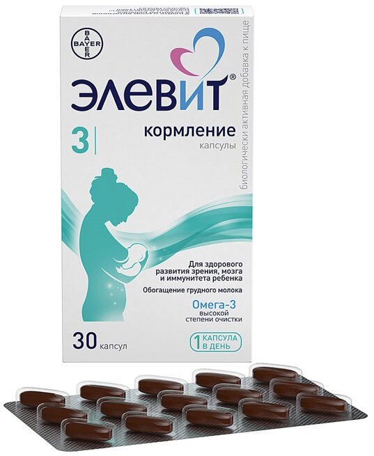 Состав Желатин, докозагексаеновая кислота (ДГК) из рыбьего жира, трикальций фосфат, агент влагоудерживающий глицерин, аскорбиновая кислота, эмульгатор соевый лецитин, носитель воск пчелиный желтый, никотинамид, цинка оксид, железа фумарат, кальция D-пантотенат (кальция D-пантетонат, носитель этилцеллюлоза), DL-альфа-токоферола ацетат, пиридоксина гидрохлорид, краситель железа оксид красный, рибофлавин, тиамина мононитрат, краситель железа оксид черный, ретинол (подсолнечное масло, бета-каротин), лютеин (сафлоровое масло, лютеин, антиокислитель DL-альфа-токоферол), фолиевая кислота, калия йодат, биотин, натрия селенит, холекальциферол (носитель эфир крахмала и натриевой соли октенилянтарной кислоты, сахароза, антиокислитель аскорбат натрия, триглицериды среднецепочечные, агент антислеживающий диоксид кремния аморфный, антиокислитель DL-альфа-токоферол, витамин D3), цианокобаламин (мальтодекстрин, регулятор кислотности цитрат натрия трехзамещенный, регулятор кислотности лимонная кислота, витамин В12). Продукт содержит компоненты, полученные с использованием генно-модифицированных микроорганизмов (ГММ). Продукт очищен от ГММ. Продукт не содержит генно-модифицированных организмов. Область применения Для реализации населению в качестве биологически активной добавки к пище – дополнительного источника омега-3 кислоты; витаминов А, В1, В2, В5, В6, В12, С, D, Е; ниацина, фолиевой кислоты, биотина, железа, йода, цинка, селена. Рекомендации по применению Кормящим женщинам принимать по 1 капсуле в день во время еды, начиная сразу после рождения ребенка и на протяжении всего периода кормления. Пищевые и биологически активные вещества Содержание в суточной дозе (в 1 капсуле) Степень удовлетворения суточной потребности кормящих женщин, %1 ДГК (омега-3), мг 200 29* Витамин А, мкг РЭ (ретинол эквивалент) 721 55 Витамин В1, мг 1,4 78 Витамин В2, мг 1,6 76 Витамин В5, мг 7 100 Витамин В6, мг 2 80 Витамин В12, мкг 2 57 Витамин С, мг 60 50 Витамин D, мкг 5 40 Витамин Е, мг ТЭ (токоферол эквивалент) 5 26 Ниацин, мг 17 74 Фолиевая кислота, мкг 200 40 Биотин, мкг 35 70 Лютеин, мкг 250 5* Кальций, мг 120 9 Железо, мг 9 50 Йод, мкг 150 52 Цинк, мг 9,5 63 Селен, мкг 35 54 1 МР 2.3.1.2432-08 «Нормы физиологических потребностей в энергии и пищевых веществах для различных групп населения РФ»; * Единые санитарно-эпидемиологические и гигиенические требования к товарам, подлежащим санитарно-эпидемиологическому надзору (контролю). Пищевая ценность 1 капсулы: углеводы – 0,1 г; жиры – 0,5 г; энергетическая ценность – 20,8 кДж (5,1 ккал). Масса нетто – 37,8 г (30 капсул), 75,6 г (60 капсул). Свойства витаминов и минералов Жирные кислоты омега-3 необходимы для здорового развития мозга и зрения ребенка. Витамин С и цинк способствуют поддержанию иммунитета. Витамины группы В принимают участие в естественном образовании энергии в организме. Витамин D способствует усвоению кальция, необходимого для здорового развития костной системы ребенка. Йод необходим для нормального функционирования щитовидной железы, способствует развитию интеллекта ребенка. Железо способствует нормальному обмену веществ матери и ребенка. Бета-каротин способствует формированию и дальнейшему развитию органов зрения ребенка. Противопоказания Индивидуальная непереносимость компонентов. Не превышать рекомендуемую суточную дозу. Перед применением рекомендуется проконсультировать