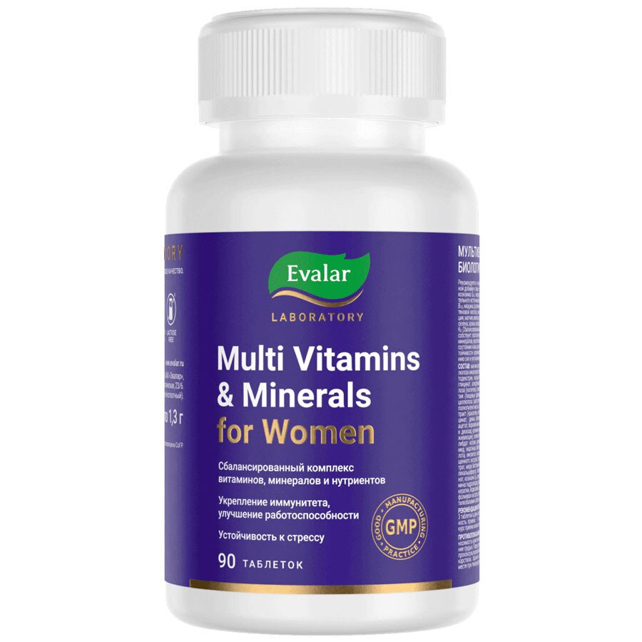 Состав: магния цитрат, кальция карбонат, целлюлоза микрокристаллическая (носитель), мальтодекстрин, кальция бисглицинат, магния бисглицинат, аскорбиновая кислота, кроскарамеллоза (носитель); компоненты пленочного покрытия (пищевые добавки): гидроксипропилметилцеллюлоза (загуститель), твин 80 (эмульгатор), полиэтиленгликоль (глазирователь), свеклы экстракт (краситель натуральный); железа бисглицинат, цинка бисглицинат, альфа-токоферола ацетат, боровой матки экстракт, стеарат кальция и диоксид кремния аморфный (агенты антислеживающие), холина битартрат, бета-каротин, молибдат натрия, крахмал кукурузный, никотинамид, марганца бисглицинат, гиалуроновая кислота, инозитол, клюквы экстракт, витекса священного экстракт, брокколи, спирулины концентрат, меди бисглицинат, пантотенат кальция, холекальциферол, гесперидин, менахинон-7, шпинат, коэнзим Q10, пиридоксина гидрохлорид, тиамина гидрохлорид, рибофлавин, ретинола ацетат, кератин, йодказеин, хрома пиколинат, керамиды, фолиевая кислота, селексен (селеноксантен), метилкобаламин, биотин Описание: Мультивитамины и минералы женские . Инновационный комплекс «Мультивитамины и минералы женские» от Evalar Laboratory содержит компоненты для поддержания красоты и профилактики старения: гиалуроновая кислота, керамиды и кератин, экстракты растений и витамины. В составе содержатся растительные компоненты не в обычном измельченном виде, а в форме высокоактивного комплекса экстрактов: боровой матки, витекса священного, клюквы, брокколи, спирулины концентрат, шпината. Эвалар перерабатывает растения на инновационном европейском оборудовании, в том числе уникальном для нашей страны. Например, только на заводе Эвалар установлена швейцарская система паровой стерилизации растительного сырья. Современные технологии производства позволяют сохранить первозданную силу природных ингредиентов и получать продукты с максимальной биологической активностью. Уникальность компонентов Биодоступные формы витаминов в составе: В12 - метилкобаламин, витамин К2 - менахинон-7 Легкодоступные хелатные формы минералов: кальция, магния, цинка, меди, марганца. Органический йод в форме легко усваиваемого йодказеина. Уникальный набор натуральных экстрактов для женского здоровья: экстракт боровой матки, витекса священного, клюквы и спирулины (Spirulina platensis) Оболочка таблетки не содержит красителей и диоксида титана. Одной упаковки - 90 таблеток - вам хватит на полный месячный курс. Ключевые компоненты и состав Содержание в 3 таблетках (суточном приеме) и % от рекомендуемого уровня суточного потребления (адекватного уровня) Витамин А 400 мкг РЭ1 50% Бета-каротин 2,4 мг 48% Витамин С 150 мг 250%3 Витамин D 15 мкг (600 МЕ) 300%3 Витамин Е 20,0 мг ТЭ2 200% Витамин К2 (МК-7) 12 мкг 10% Тиамин (витамин В1) 3 мг 214,3%3 Рибофлавин (витамин В2) 3 мг 187,5%3 Ниацин (витамин В3) 20 мг 111,1%3 Витамин В6 4 мг 200%3 Фолиевая кислота 400 мкг 200%3 Витамин В12 (метилкобаламин) 3 мкг 300%3 Биотин 150 мкг 300%3 Пантотеновая кислота 6 мг 100%3 Кальций 300 мг 30% Магний 150 мг 37,5% Железо 18 мг 128,6% Цинк 15 мг 100% Медь 2 мг 200%3 Марганец 2 мг 100% Йод 150 мкг 100% Селен 70 мкг 100%3 Хром 200 мкг 400%3 Молибден 75 мкг 107,1%3 Холин 10 мг 2% Инозит 10 мг 2% Гесперидин 5 мг 2,5% Комплекс экстрактов: боровой матки, витекса священного, клюквы 70 мг - Брокколи 10 мг - Спирулины концентрат 10 мг - Шпинат 5 мг - Коэнзим Q10 5 мг 16,7% Гиалуроновая кислота 15 мг 30% Кератин 2,5 мг - К