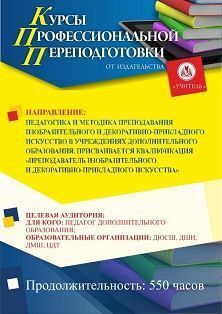 Педагогика и методика преподавания изобразительного и декоративно-прикладного искусства в учреждениях дополнительного образования. Присваивается квалификация «Преподаватель изобразительного и декоративно-прикладного искусства» (550 ч.)
