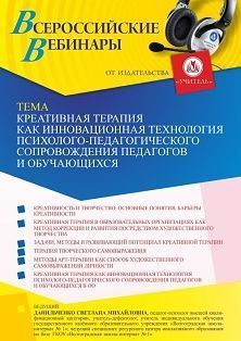 Вебинар «Креативная терапия как инновационная технология психолого-педагогического сопровождения педагогов и обучающихся» Вебинары УчМет | V4.Ru: Маркетплейс