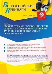 Вебинар «Дополнительное образование детей: сущность и содержание, ценности, функции и основы в системе образования РФ»