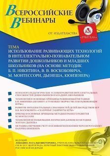 Вебинар «Использование развивающих технологий в интеллектуально-познавательном развитии дошкольников и младших школьников (на основе методик Б. П. Никитина, В. В. Воскобовича, М. Монтессори, Дьенеша, Кюизенера)»