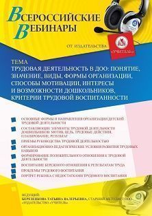 Вебинар «Трудовая деятельность в ДОО: понятие, значение, виды, формы организации, способы мотивации, интересы и возможности дошкольников, критерии трудовой воспитанности»