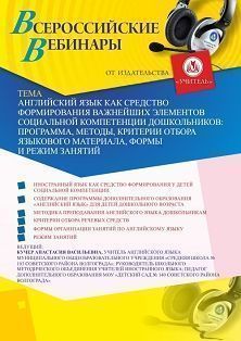 Вебинар «Английский язык как средство формирования важнейших элементов социальной компетенции дошкольников: программа, методы, критерии отбора языкового материала, формы и режим занятий»