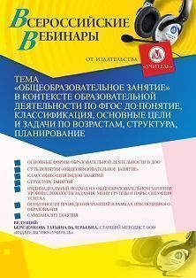 Вебинар «“Общеобразовательное занятие” в контексте образовательной деятельности по ФГОС ДО: понятие, классификация, основные цели и задачи по возрастам, структура, планирование»