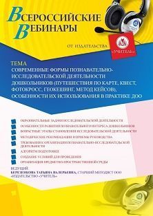 Вебинар «Современные формы познавательно-исследовательской деятельности дошкольников (путешествия по карте, квест, фотокросс, геокешинг, метод кейсов), особенности их использования в практике ДОО»