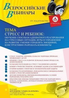 Вебинар «Стресс и ребенок: обучение способам адекватного реагирования на стрессовые ситуации, игры и упражнения на развитие умения управлять эмоциями, конструктивно разрешать конфликты»