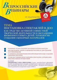 Вебинар «Постановка спектаклей в ДОО как средство активной совместной творческой деятельности и обогащения жизненного опыта детей: технологии создания сценарных материалов»