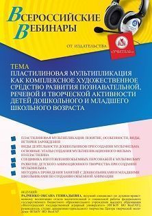 Вебинар «Пластилиновая мультипликация как комплексное художественное средство развития познавательной, речевой и творческой активности детей дошкольного и младшего школьного возраста»