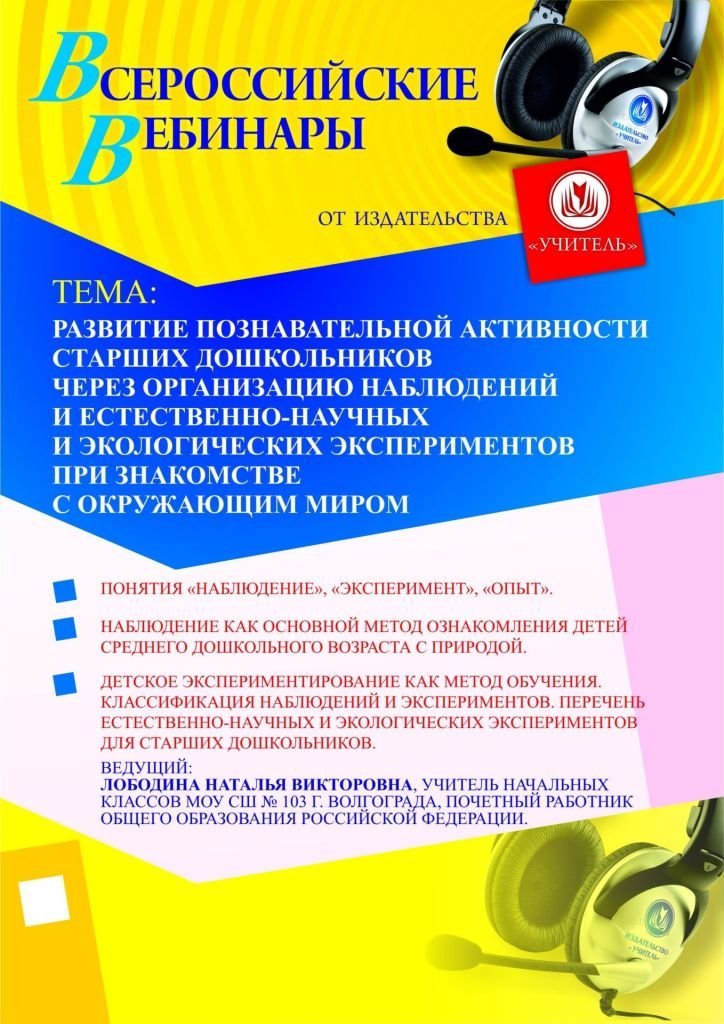 Приглашаем воспитателей и руководителей ДО, старших воспитателей, методистов, логопедов, педагогов-психологов принять участие в offline-вебинаре «Развитие познавательной активности старших дошкольников через организацию наблюдений и естественно-научных и экологических экспериментов при знакомстве с окружающим миром».