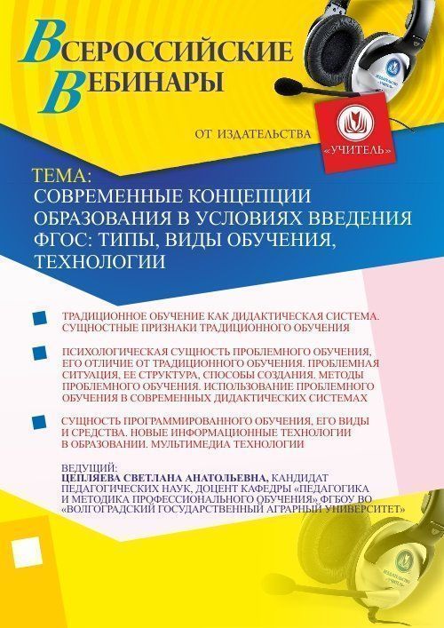 Приглашаем педагогов и специалистов среднего профессионального образования; педагогов и специалистов дополнительного профессионального образования; специалистов, не имеющих педагогического образования; студентов педагогических вузов и ссузов принять участие в offline-вебинаре «Современные концепции образования в условиях введения ФГОС: типы, виды обучения, технологии».