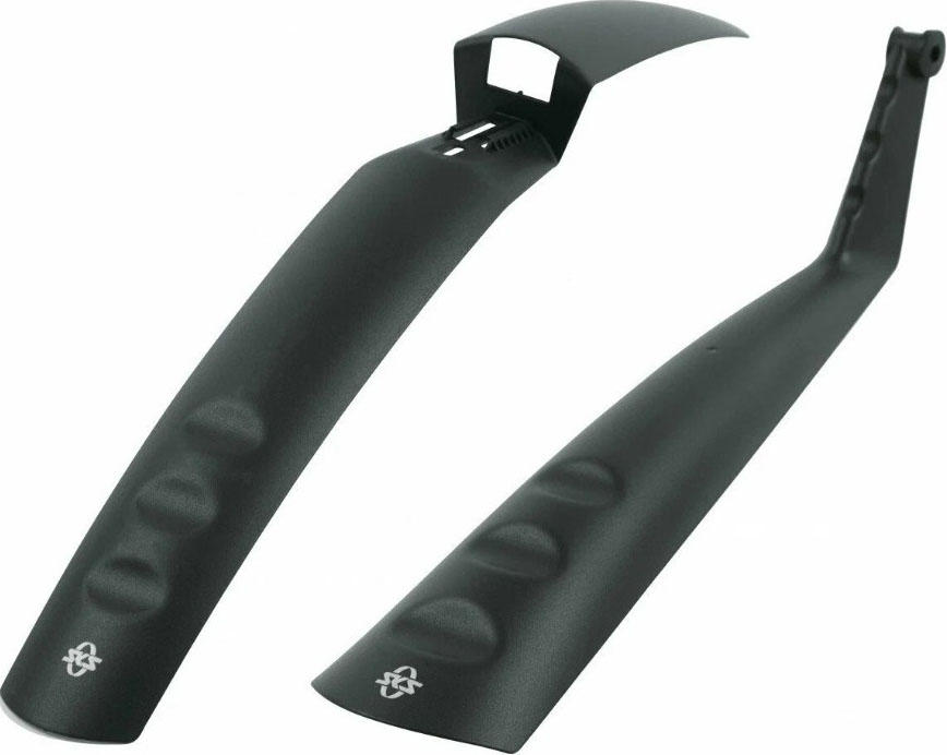 Данный комплект - универсальное решение для горных и гибридных велосипедов с диаметром колеса 26". Переднее крыло устанавливается в шток вилки, заднее крепится на подседельный штырь любого диаметра. Композитный пластик обеспечивает высокую надежность и малый вес - всего 295г.