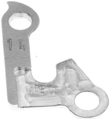 Алюминиевый держатель заднего переключателя "петух" от отечественного производителя Meta. Изготовлен методом фрезеровки из дюралюминия. Перед покупкой внимательно сверяйте форму и расположение крепежных отверстий с имеющимся образцом или же рамой велосипеда. Совместим с рамами велосипедов: