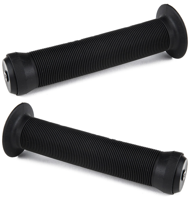 Грипсы с ограничительными фланцами для велосипедов BMX. Обладают ребристой фактурой для надежности хвата и мягким компаундом для абсорбции ударов при приземлениях. Комплектуются якорными заглушками руля.