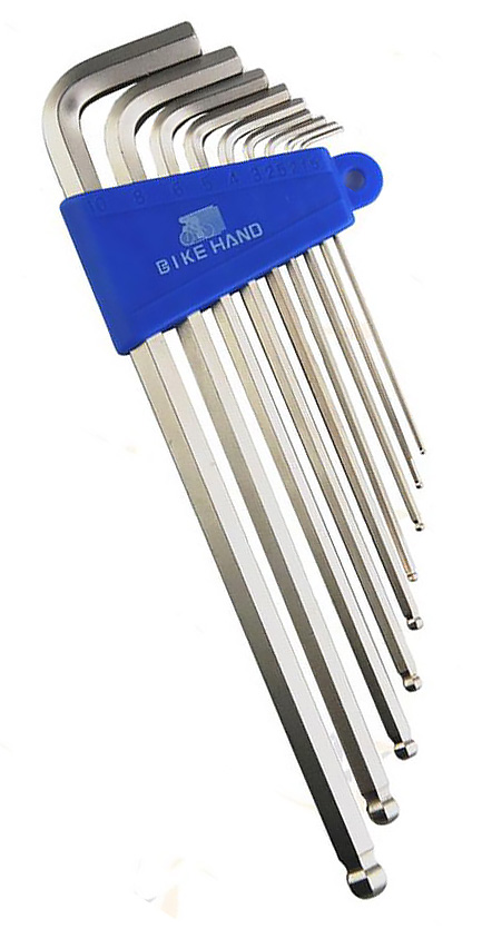 Расширенный набор шестигранных ключей Bike Hand. Перечень размерностей покрывает все узлы велосипеда. Обратная сторона является шаровой и позволяет подбираться ключом в труднодоступные места. Собраны вместе в удобном пластиковом органайзере. Высокое качество изготовления для домашнего и профессионального использования.